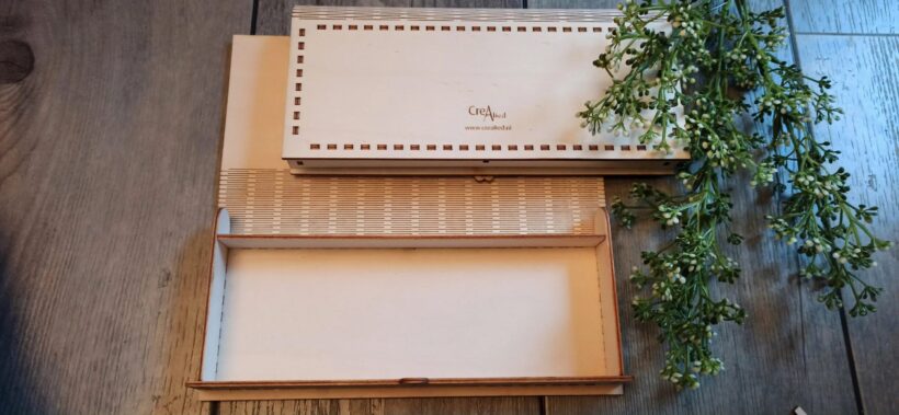 De afmetingen zijn 24cm x 11,5 cm x 3cm. Binnenin is een een ruimte van 22,5 cm x 7,5 cm x 2,5 cm om iets in te doen.