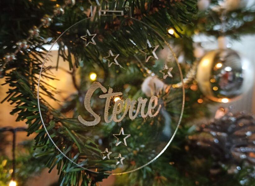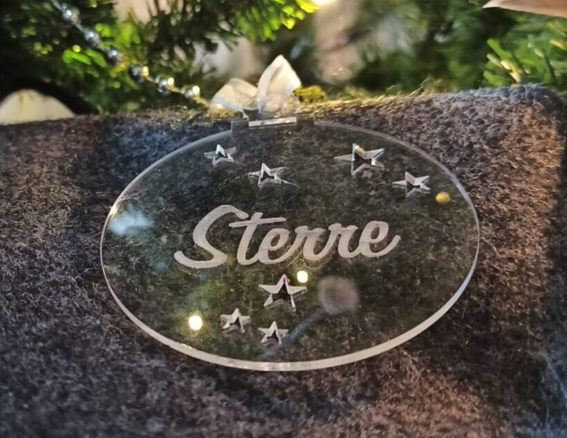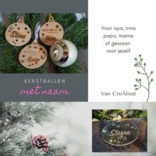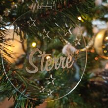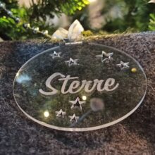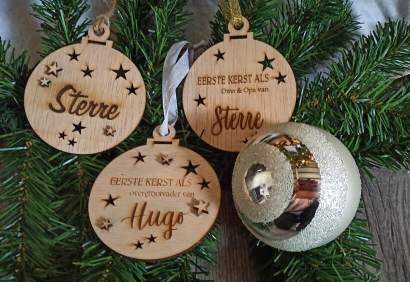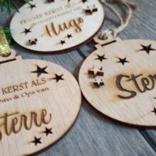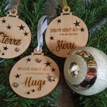 De ballen van acrylglas zijn aan de achterkant gegraveerd en worden, net zoals de houten ballen, met een mooi ophangkoordje geleverd.