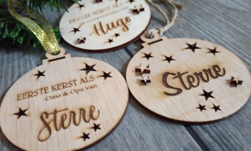 Deze kerstballen hebben een stijlvol design met gesneden sterren en een gegraveerde naam.
