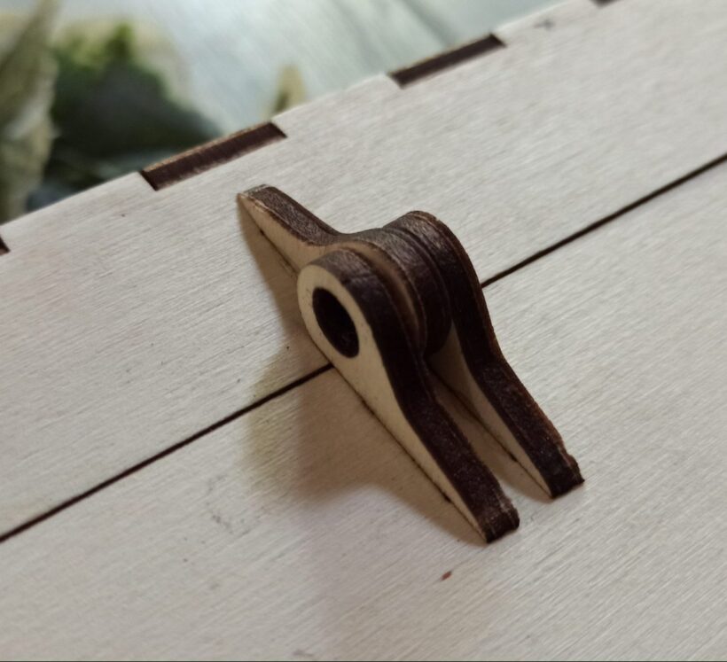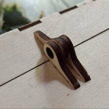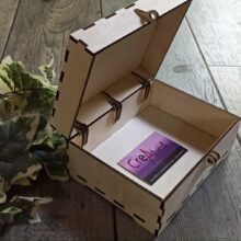 Een op maat gemaakt houten kistje om mooie dingen in te bewaren of, zoals hier, toegepast als giftdoos. Helemaal van hout, dus ook de scharniertjes.