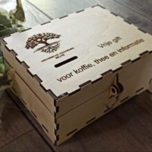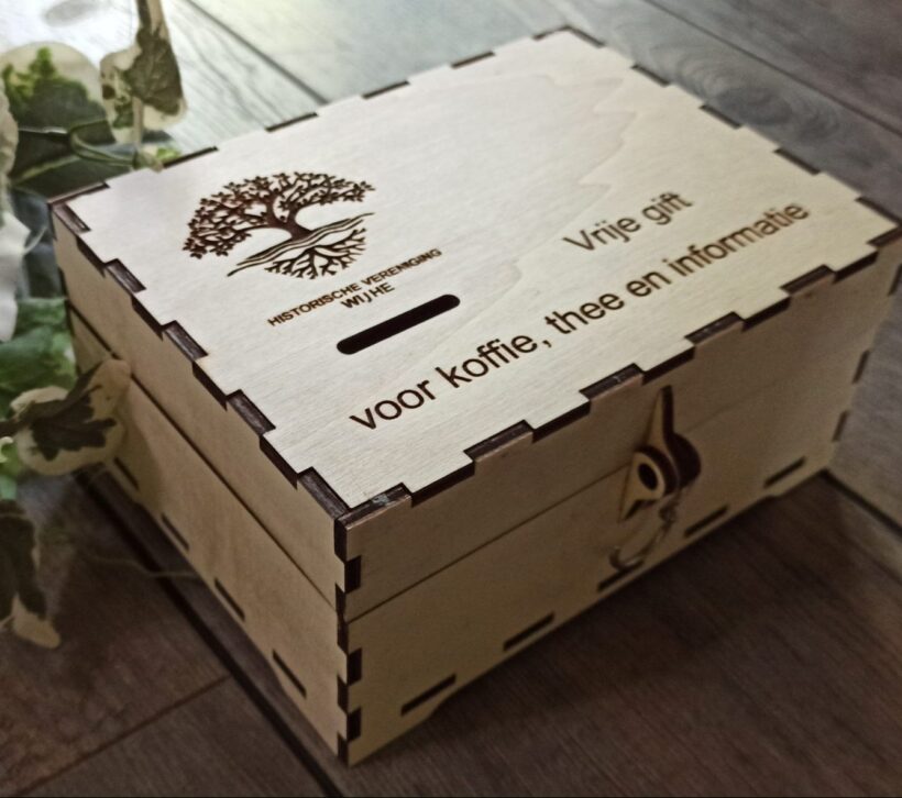 Standaard wordt het geleverd zonder gravure en zonder gleuf in het deksel. Je kunt het zelf decoreren of beschilderen en direct bestellen via de webshop.