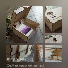 Wil je een personalisatie toevoegen, stuur me dan een mailtje (info@crealied.nl) met een foto van dit kistje en je wensen voor het personaliseren. Ga er daarbij van uit dat er ongeveer 10 euro bij komt voor het maken van de gravures. Een eenvoudige tekstregel komt op 5 euro extra.