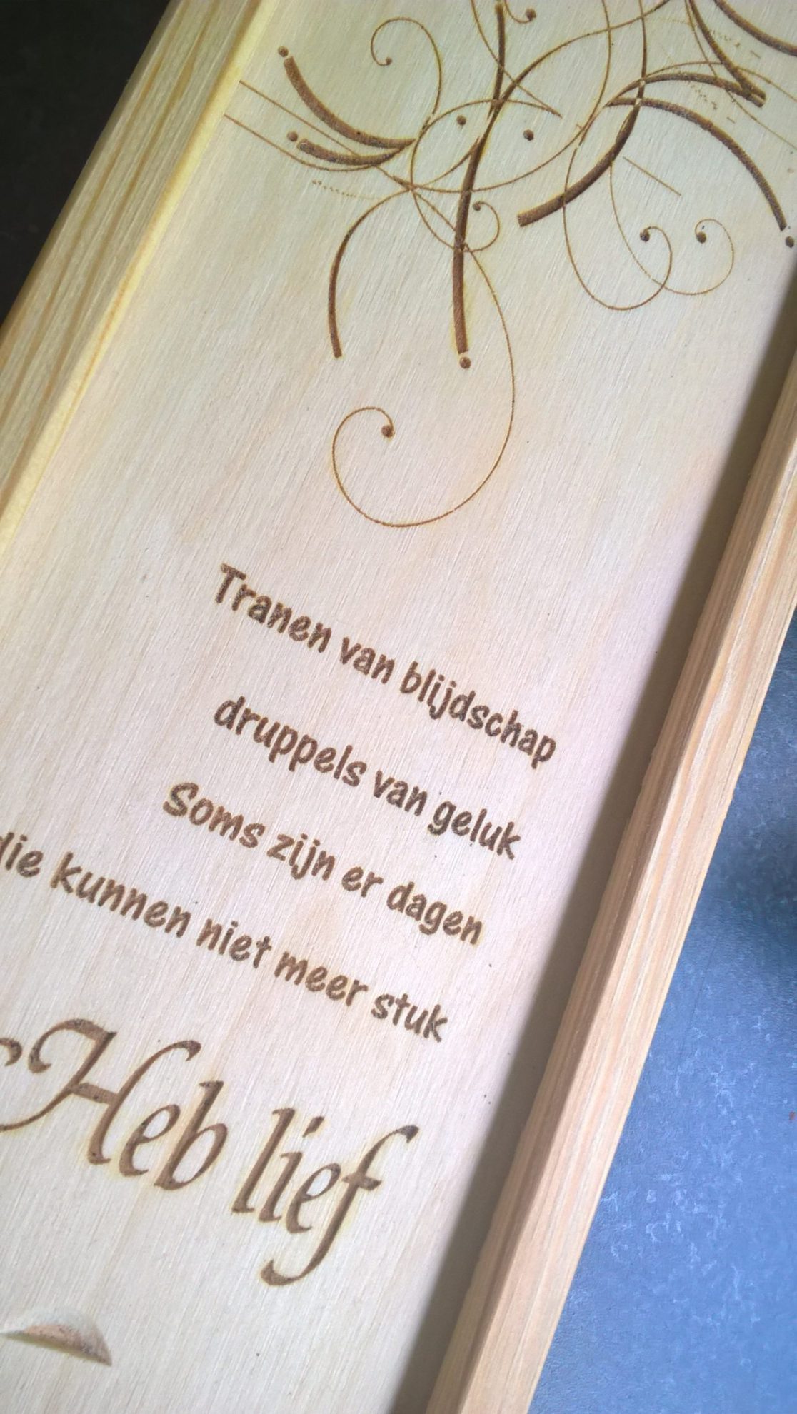 Bijvoorbeeld het deksel van de wijnkist…. Deze kan ik op maar voor je maken, met een spreuk, tekst of afbeelding.